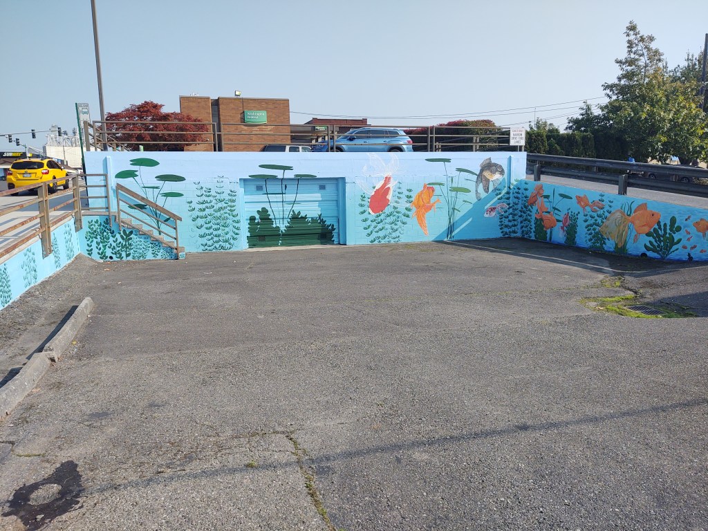 Longtime Ferndale resident and mural artist Jennifer Dunn said she has been working for several weeks on a goldfish and lily pad design that extends across 3 walls on the northeast corner of Alder Street and 3rd Avenue. The walls are on property owned by WaFd Bank (formerly known as Washington Federal Savings and Loan). Xczar said Dunn submitted 6 designs for consideration, all of which FAC approved and the manager at the Ferndale WaFd branch chose the design being installed.