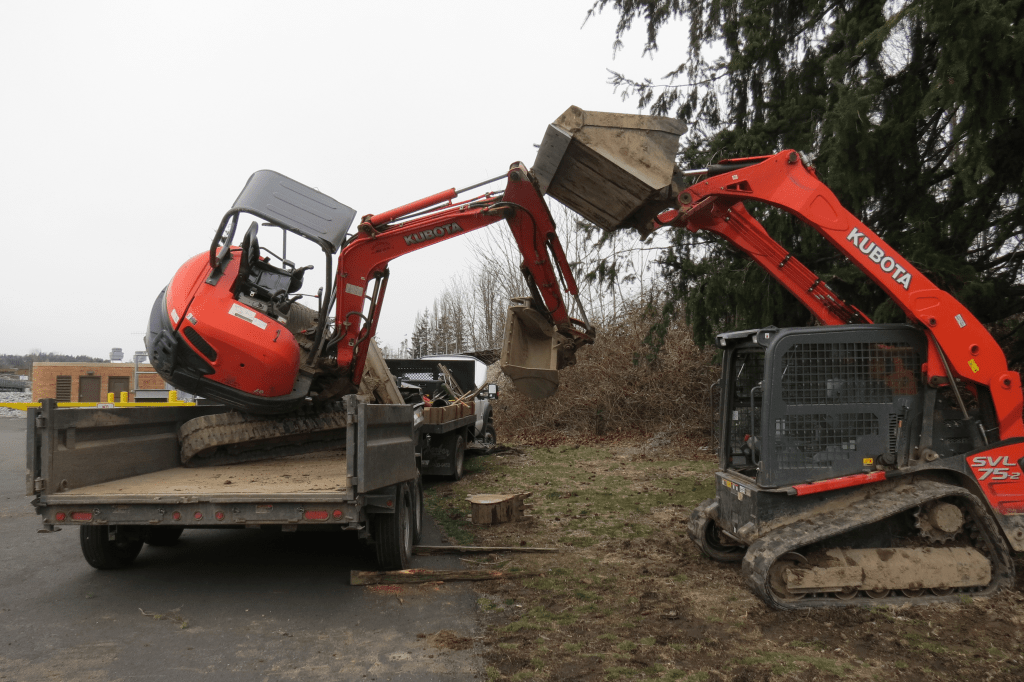 A compact front loader was used to try and return a toppled compact excavator to its trailer after it collided with the bnsf bridge over main street 2018-02-21