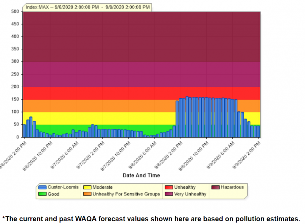 Poor air quality may continue into the weekend, as wind shifts could bring smoke from fires to the south into the region. Unhealthy air quality means that everyone, especially sensitive groups, should limit time spent spent outdoors, avoid strenuous activities outdoors, and choose light indoor activities.National Weather Service air quality alert statement – September 9, 2020