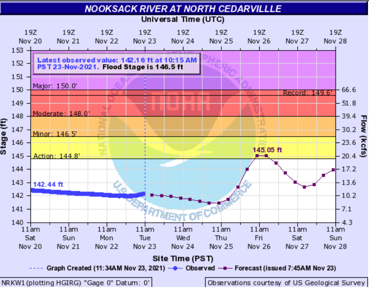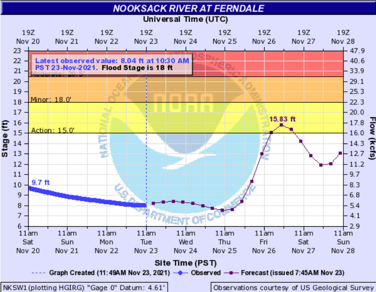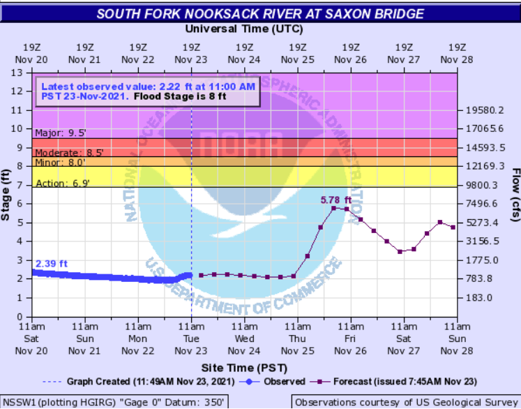 Nooksack River level forecasts as of 8am today, November 23rd, (below) show the Saxon Bridge gauge on the south fork cresting below action state while the Cedarville and Ferndale gauges reach action stage while remaining below minor flood stage.