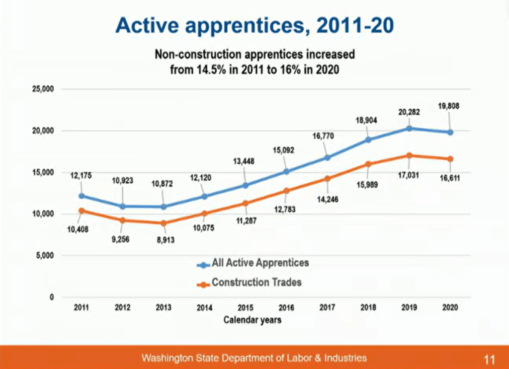 The number of Washingtonians enrolled in apprenticeship programs increased last year to the highest number in the last decade.