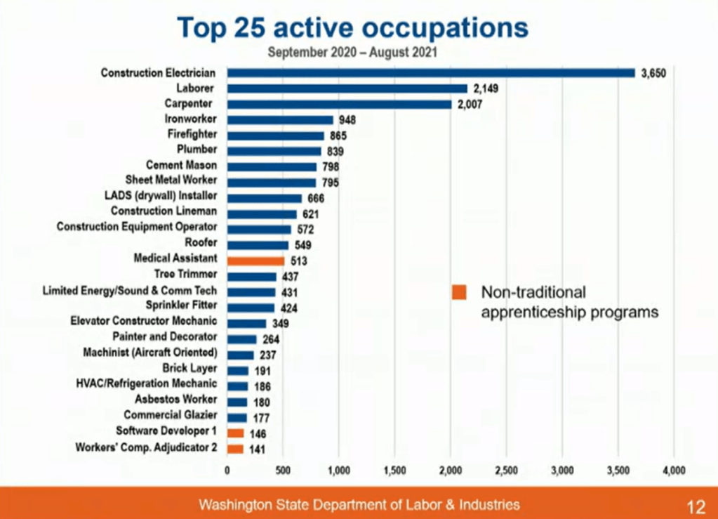 Apprenticeship programs for electricians, laborers, carpenters and ironworkers still top the list of active participants, but other non-traditional apprenticeships like medical assistants, software developers and workers’ comp adjudicators have reached the list of top 25 apprenticeships.