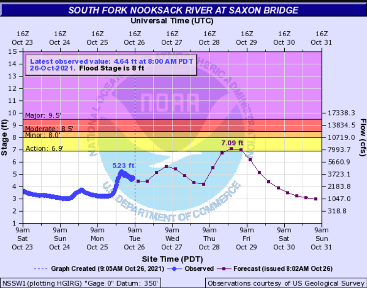 As of October 26th, hydrological forecasts at 3 gauges on the Nooksack River show concern for the potential for flooding. Those forecasts are as indicated on the following graphics.