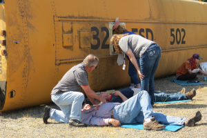 bus drivers locate, assess and treat volunteer victims during yellow rhino emergency preparedness exercise 2