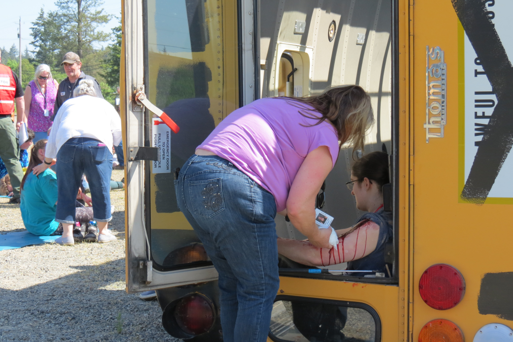 bus drivers locate, assess and treat volunteer victims during yellow rhino emergency preparedness exercise