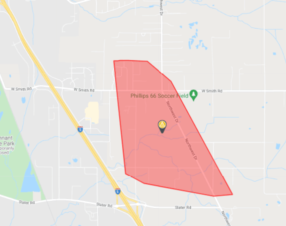 Northwest Drive was closed to all traffic between Larson Road and W Smith Road while Puget Sound Energy crews were on site making repairs to the downed pole and wires. Signs were in place indicating a detour route via Aldrich Road.