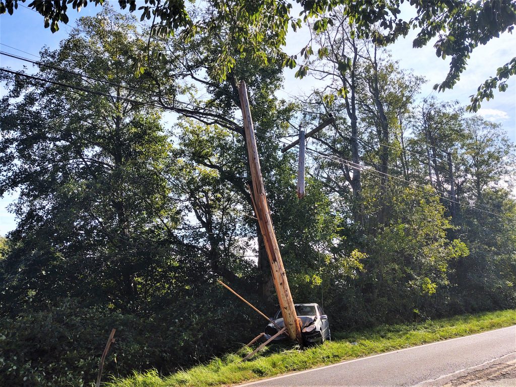 The power pole sustained extensive damage as well. The backside of the pole laid on the side of the road several feet from the pole appearing to have separated from the pole due to the force of the impact. Several feet of the top of the pole and the attached cross arms could be seen separated from the main pole and supported by the attached wires.