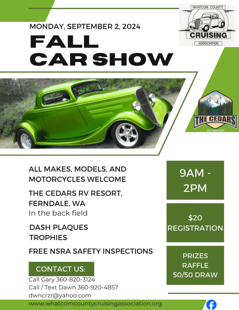 9am to 2pm on Monday, September 2nd, at the Cedars RV Resort in Ferndale