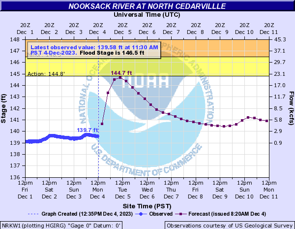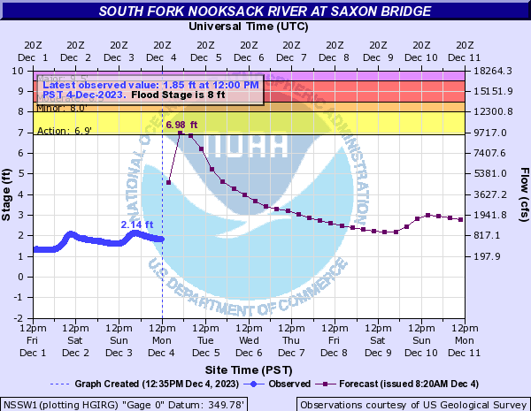 As of 8:30am on Monday, December 4th, the river level at gauge locations on the Nooksack River is forecast to crest below the action stage range except for the Ferndale gauge where it is forecast to crest just below minor flood stage.