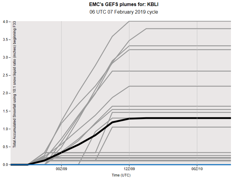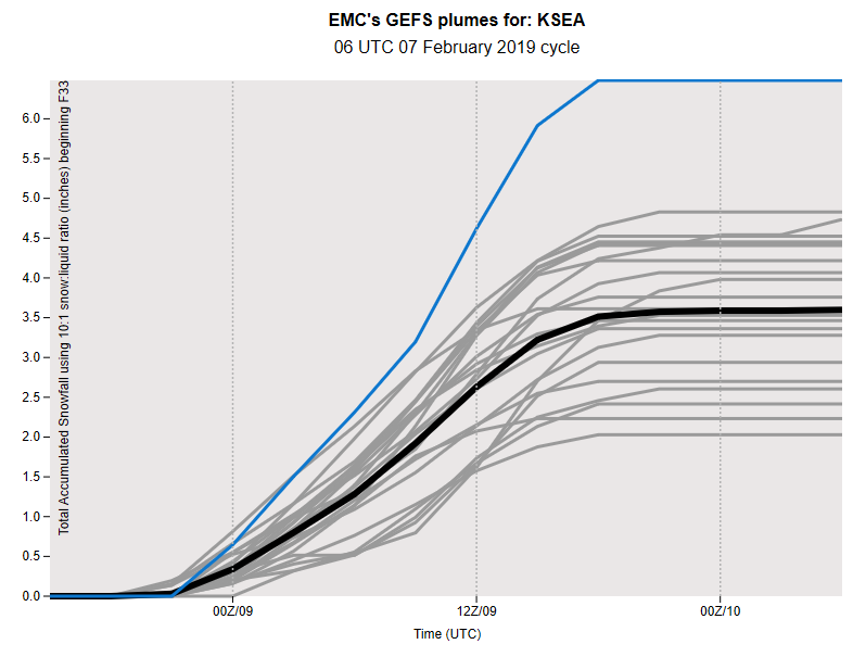 According to the Seattle area graph, the primary run says to expect a total of 6.5 inches of snow and is also highest run. The mean is at 3.6 inches, more than twice what was forecast for Bellingham.