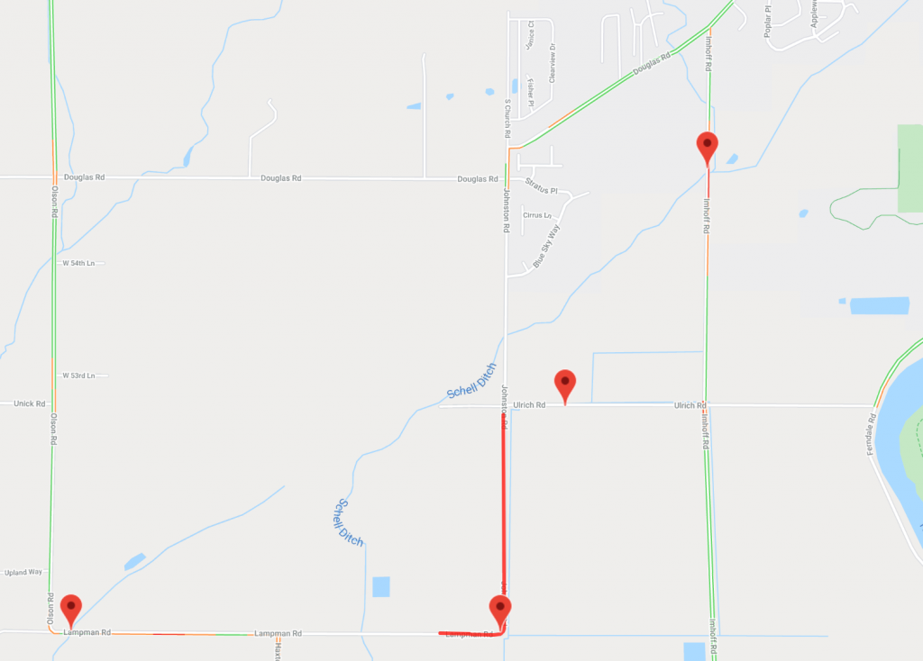 Primary east-west arterials Slater Road and Marine Drive were closed overnight forcing detour traffic onto Imhof Road and Douglas Road to Main Street. But Imhof Road has its own section of road covered by inches deep flowing stream water. Nearby Ulrich Road, between Imhof Road and S Church road is covered with swift flowing stream water and S Church Road and Lampman Road have been closed due to water over much of the roadway south of Ulrich Road.