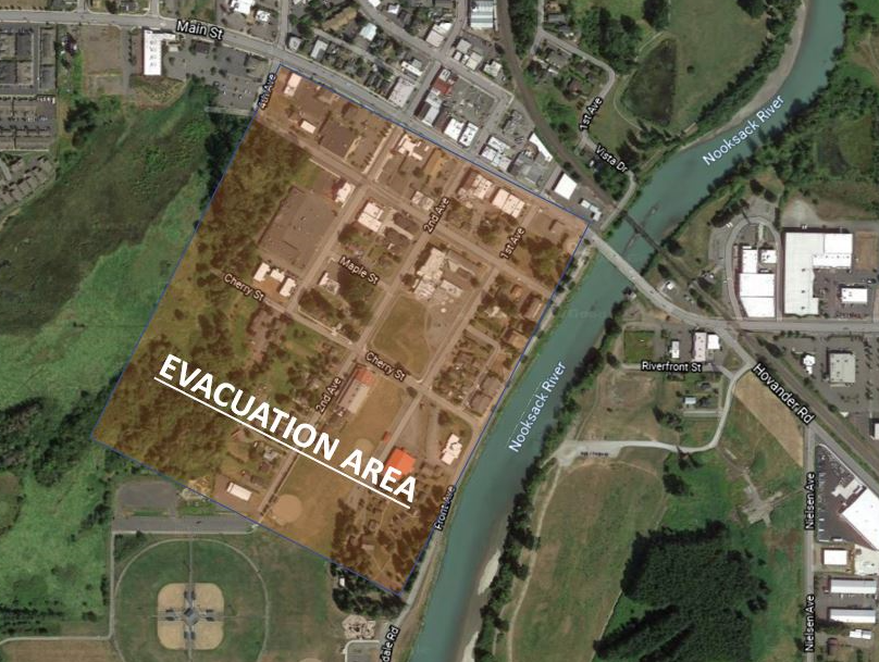 Out of an abundance of caution, the City of Ferndale is requesting the voluntary evacuation of all residents and businesses in the area south of Main Street between 4th Avenue and the Nooksack River, effective immediately. The Nooksack River has not yet reached its crest, and the potential exists for the river to breach the existing levee. Residents and businesses are encouraged to secure and then evacuate their properties; the City will inform the public when it is safe to return. All residents outside of the voluntary evacuation area are requested to avoid any unnecessary trips and to stay off the roadways, in order for emergency and first responders to effectively respond to the emergency.