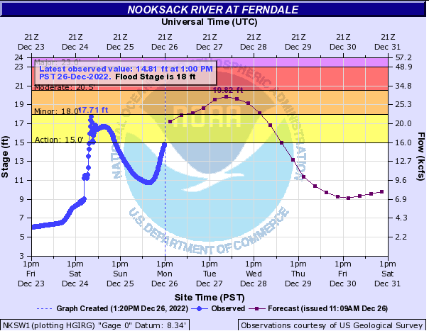 While not mentioned in the flood warning statement, the current river level forecast at Ferndale expects it to crest in the late evening tomorrow, Tuesday, December 27th, in the minor flood range, a foot short of reaching moderate flood range.