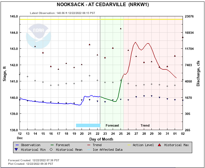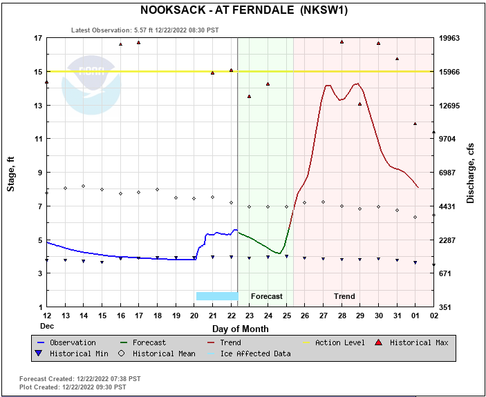 Current river level forecasts for key locations along the Nooksack River in Whatcom County reflect the expected increases but fall short of reaching “Action Levels” as detailed below.