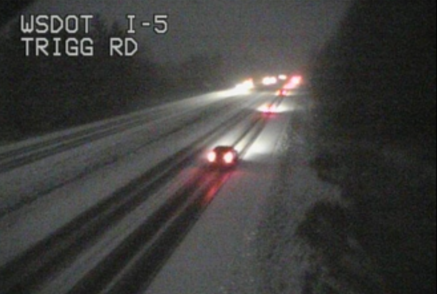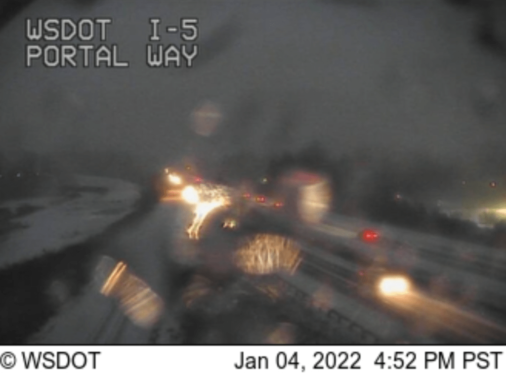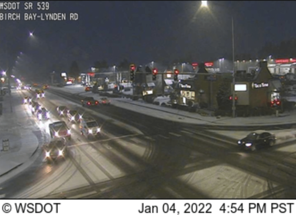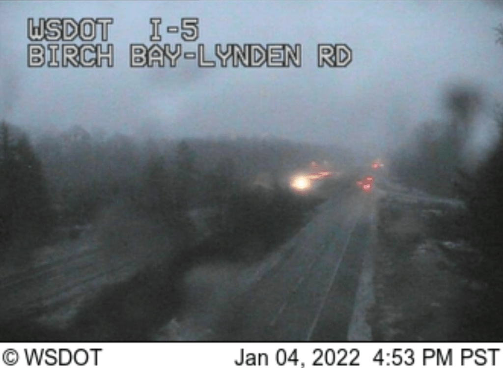 According to Washington State Department of Transportation (WSDOT) traffic cameras, sections of I-5 south of Slater Road and north of Birch Bay-Lynden Road are bare and wet while areas through Ferndale and Custer are showing obvious accumulations in the roadway.