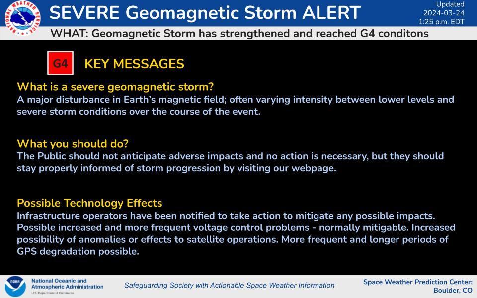 The 23 March CME arrived at around 24/1411 UTC (7am, March 24th, local time). Severe (G4) geomagnetic storming has been observed and is expected to continue through the remainder of the 24 March-UTC day and into the first half of 25 March. NOAA Space Weather Prediction Center (March 24, 2024)