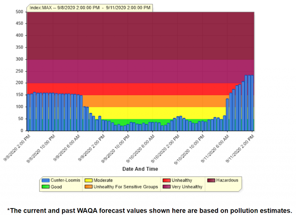 An air quality alert remains in effect to 11am Monday, September 14th, for Puget Sound region counties. Air quality is expected to be within the Unhealthy, Very Unhealthy and Hazardous ranges across most of western Washington through at least Monday according to the 3pm update to the alert. Western Washington residents are warned to expect conditions worsen overnight as calmer winds will allow smoke to settle closer to the ground.