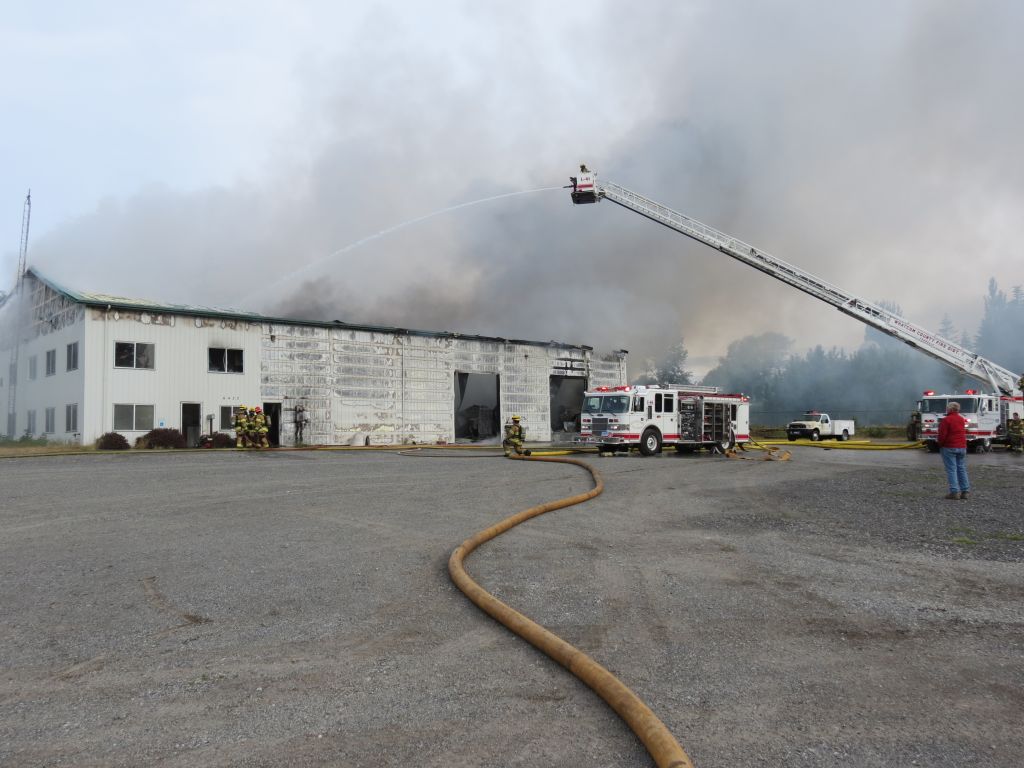 Firefighters continued to knock back the fire that destroyed the building that housed Friberg Construction (June 17, 2017). Photo: Discover Ferndale