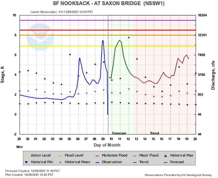 The current Nooksack River level forecast shows river levels cresting around the low end of the minor flood stage ranges.