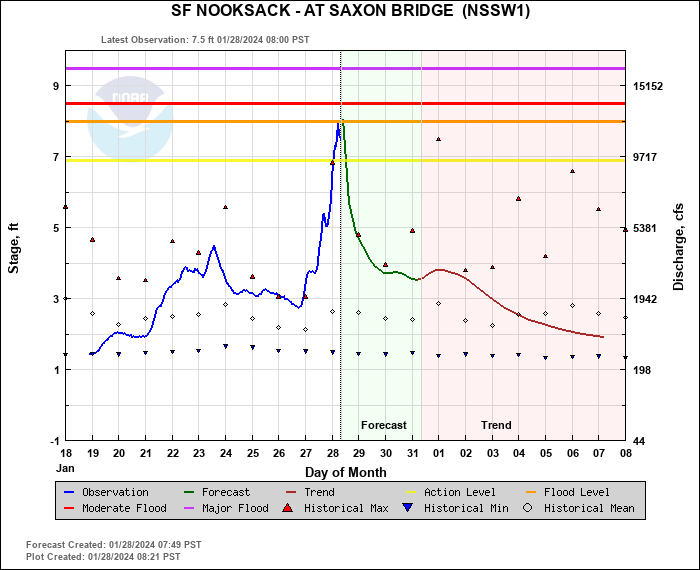 A series of warm and wet weather systems have brought heavy rains, both in the lowlands and in the mountains of western Washington. As a result of snow melt and rains, the river level is expected to crest today at or near flood stage at the Saxon Bridge flood gage on the South Fork, at the North Cedarville gage on the Nooksack River and at the Ferndale gage on the Nooksack River.