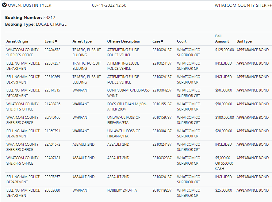 According to the Bellingham Police press summary log, Owen was arrested at the Whatcom County Courthouse and returned to custody on March 11th. According to Whatcom County Jail records, he was then charged with suspicion of having committed multiple new crimes and arrested on multiple warrants for failing to appear in court on multiple cases.