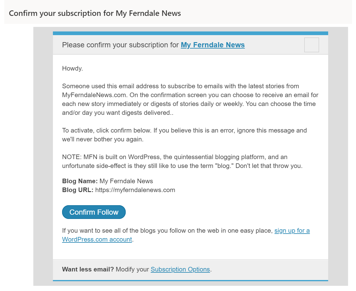 Whatcom News is built using the WordPress content management system. WordPress is what over 25% of all websites are built on including BBC America, TechCrunch and Vogue. WordPress also provides a powerful and flexible email subscription capability that puts you, the reader, in charge. You’re in charge of how frequently you want to be notified about new stories and when you want to be notified, right down to which day of the week and at what time.