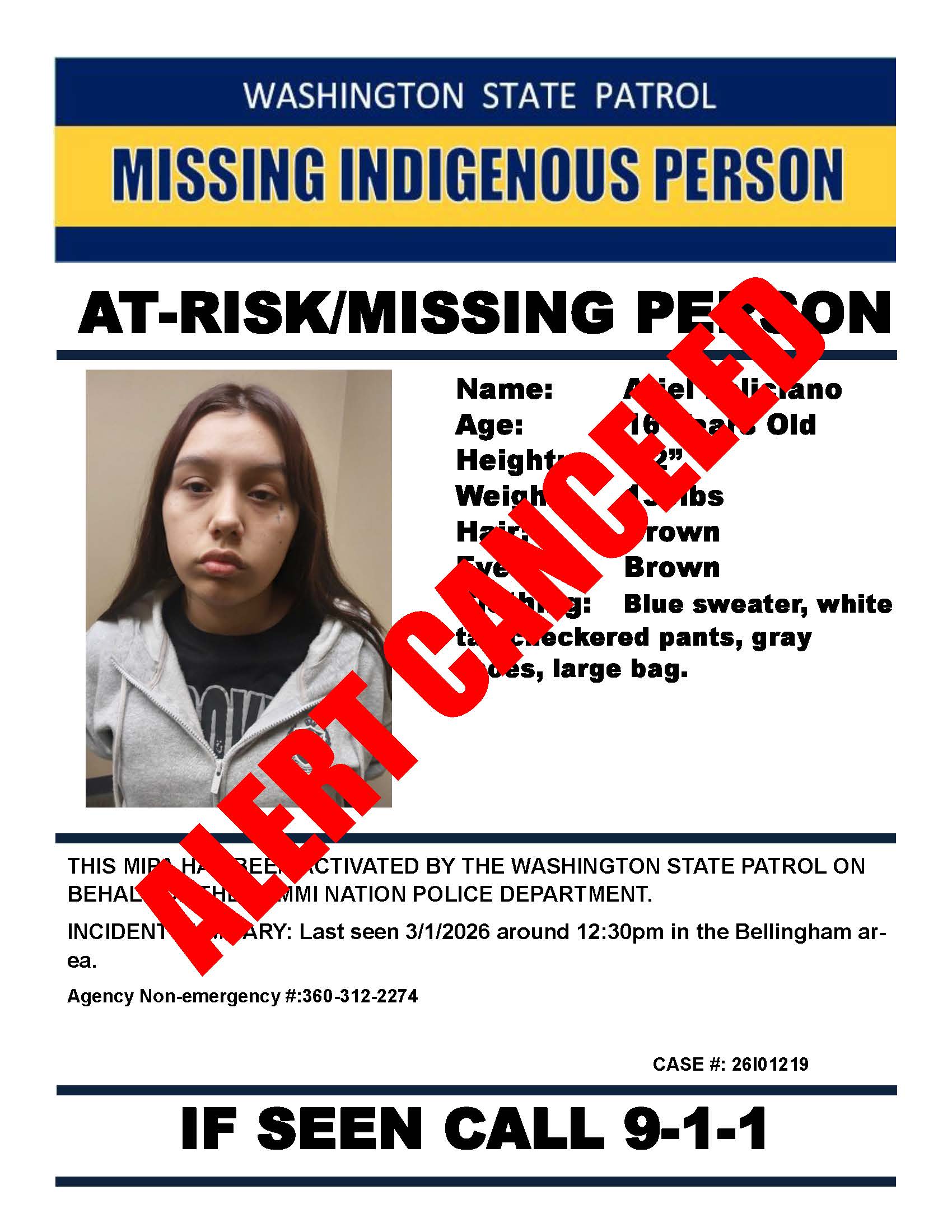 Cancelled: Missing person out of Bellingham By Staff on March 2, 2026 7:16am Update 7am 3/5/26: Located Share this with friends/family via: Share on Facebook (Opens in new window) Facebook Share on Bluesky (Opens in new window) Bluesky Share on X (Opens in new window) X Share on Reddit (Opens in new window) Reddit Share on Nextdoor (Opens in new window) Nextdoor Share on Threads (Opens in new window) Threads Share on LinkedIn (Opens in new window) LinkedIn Share on Tumblr (Opens in new window) Tumblr Share on WhatsApp (Opens in new window) WhatsApp Print (Opens in new window) Print Email a link to a friend (Opens in new window) Email Discover more from Whatcom News Subscribe to get the latest posts sent to your email. Type your email… Subscribe