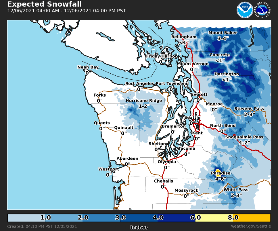 There will likely be period of a lowland wintry mix across the region late tonight through tomorrow morning, with a chance for light snow across portions of Whatcom and Skagit Counties. Snow-levels will be down to the surface here, with HREF guidance favoring more concentrated areas of precipitation here around daybreak on Monday. Expect snowfall to be heaviest at this time, with some portions of Whatcom and northern Skagit Counties seeing higher probabilities of at least 0.5 to 1″ of snowfall accumulation through Monday morning. Accumulations will be most likely on grassy and elevated surfaces, with some potential of sticking on lesser traveled roadways in these areas.National Weather Service Seattle office (December 5, 2021)