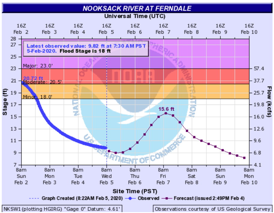 The current Nooksack River level forecast at Ferndale calls for the river to crest late Friday morning at 15.6 feet. While significantly below the 20.9 crest which occurred last weekend some road impacts are still possible at that level.
