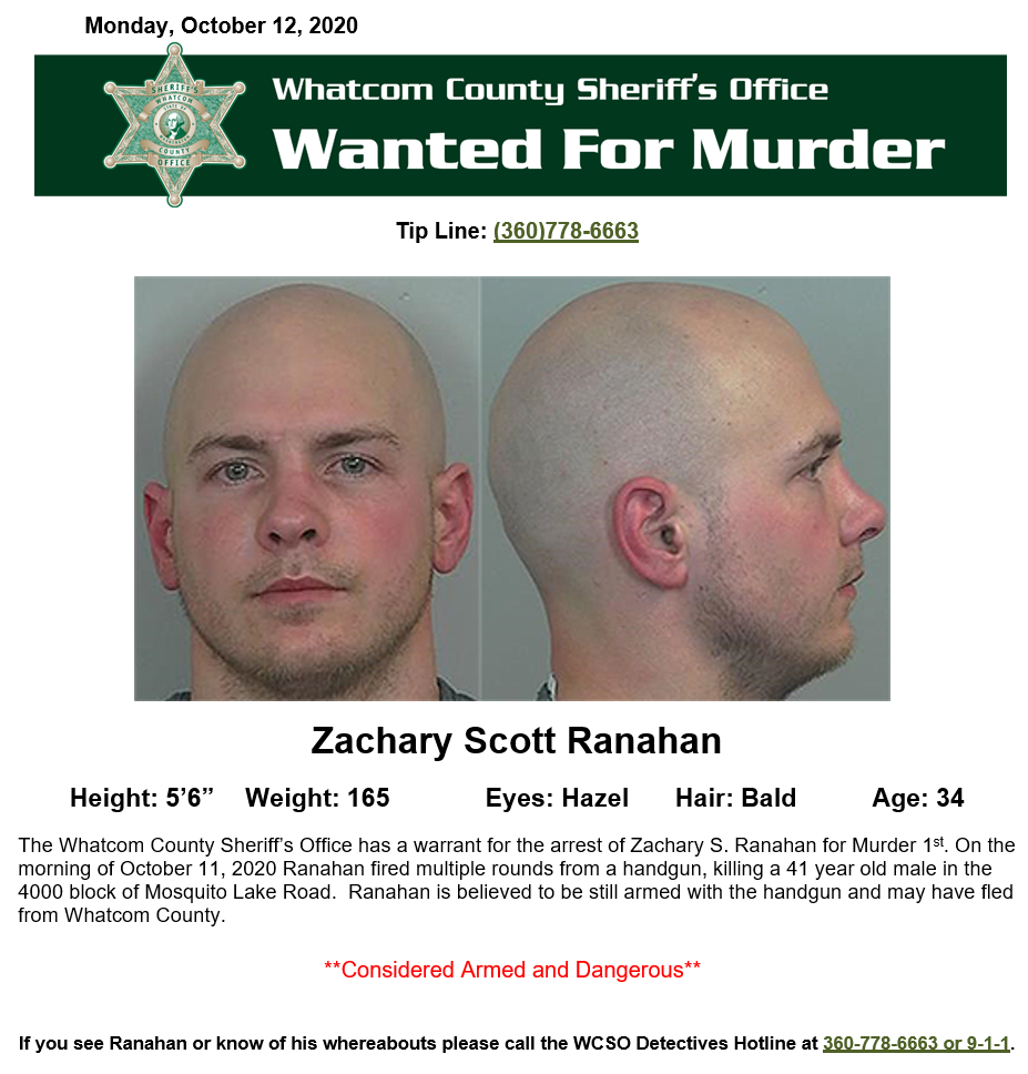 Ranahan is wanted in the murder of 41-year-old Clinton E. Gulick of Bellingham. Gulick was found by a passerby deceased on a gravel pullout alongside the road lying next to a vehicle with its engine running about 9am Sunday.