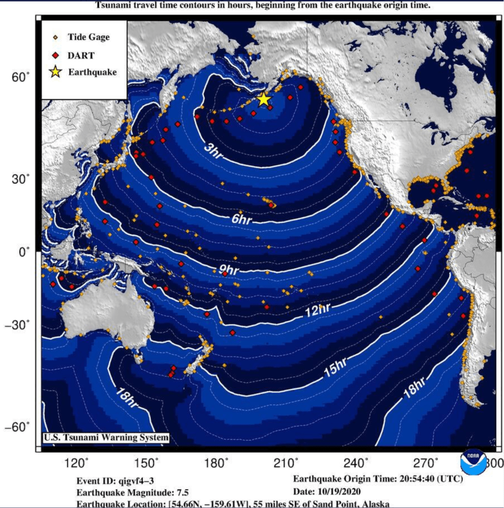 A M7.5 earthquake that occurred about 1:55pm Pacific Daylight Time today, October 19th, located 55 miles southeast of Sand Point, Alaska, at a depth of 25 miles was the cause of tsunami warnings in the immediate areas in Alaska. But officials said not to expect a tsunami along the west coasts of Canada and the lower United States.