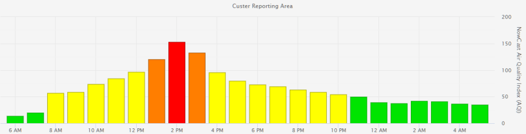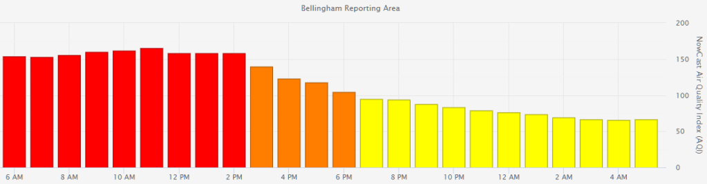 As of 5am this morning, air quality conditions were reported in the MODERATE range by air monitoring stations in Bellingham and Maple Falls. This is much improved over yesterday morning’s reporting of UNHEALTHY.