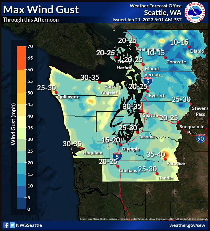 Breezy southeasterly winds ahead of the low will really pick up after 8-9 am, with a quick shift to westerly winds along the front around the 4-5 pm timeframe. National Weather Service Seattle office (January 21, 2023)