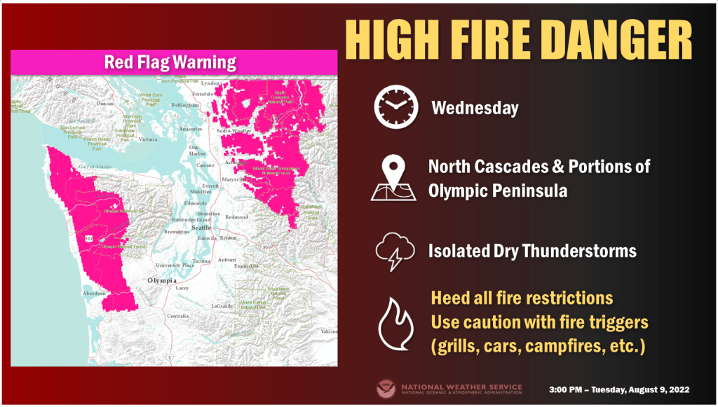 WHATCOM COUNTY, Wash. — Forecasters in the Seattle office of the National Weather Service today issued a red flag warning for the west slopes of the north Cascades above 1,500 feet from 2am on Wednesday, August 10th, to 2am on Thursday, August 11th. Red flag warnings alert to increased risk of fire danger.