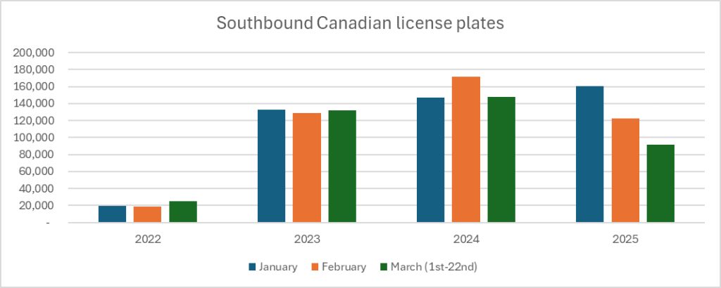 The same cannot be said for southbound Canadian vehicle volumes which, with the exception of January, are at or lower than 2023 levels. Compared to 2024, 2025 February traffic was off by 25% which includes travel challenges due to extreme winter weather during the first 2 weeks and March traffic (from the 1st to the 22nd) is off by 38%.