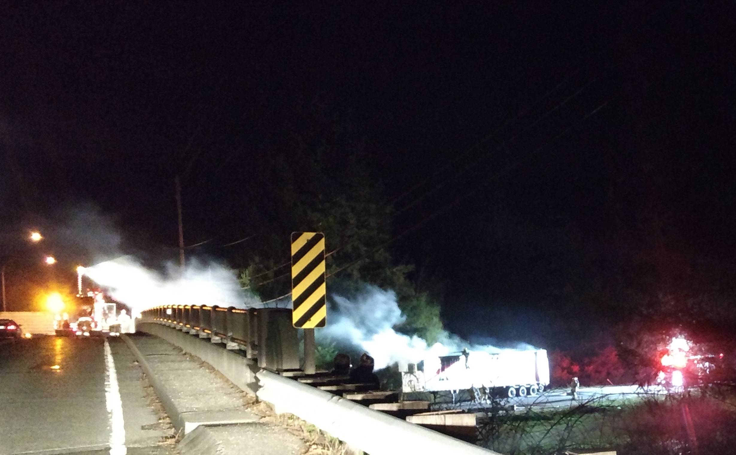 Whatcom County Fire District 7 Fire Chief Larry Hoffman said there were no injuries but the fire presented some unique challenges. The fire was fueled by the 53-foot trailer’s load of shredded plastic. They put water on the fire from fire engines at ground level and also from a fire engine positioned on the overpass.