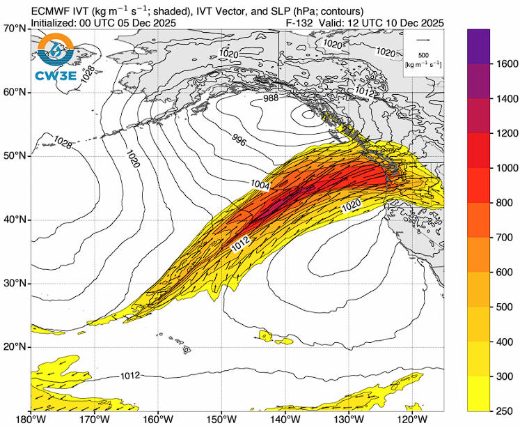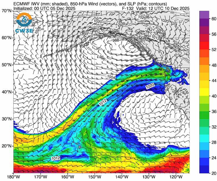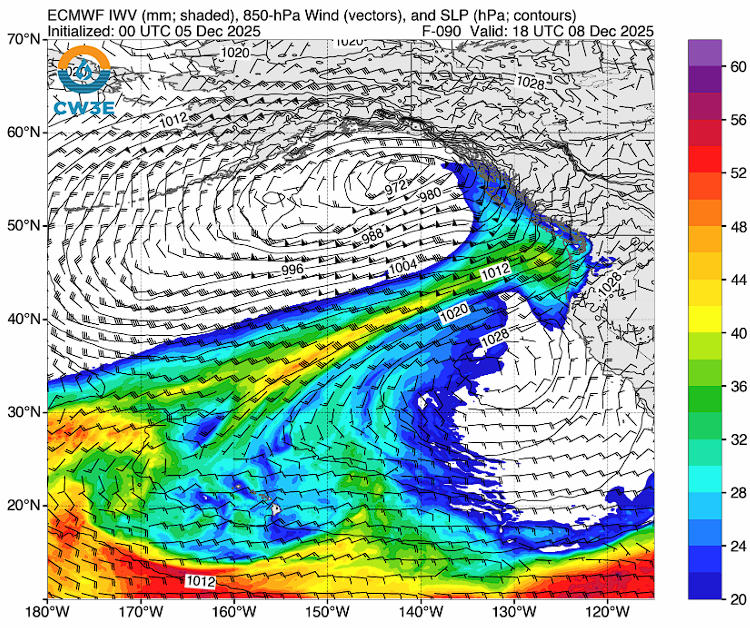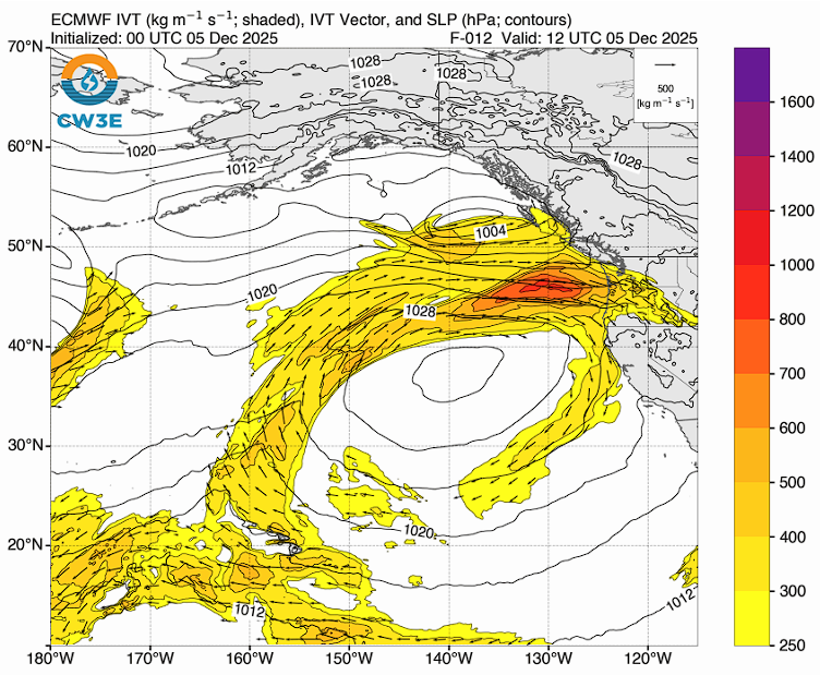 These weather patterns are the result of “Atmospheric Rivers” which are long narrow systems of strong winds and heavy moisture content in the upper atmosphere. The graphics below reflect the forecasted wind speed (yellow/red) and moisture content (blue/yellow/red) of these systems over the next few days as they reach the Puget Sound region.