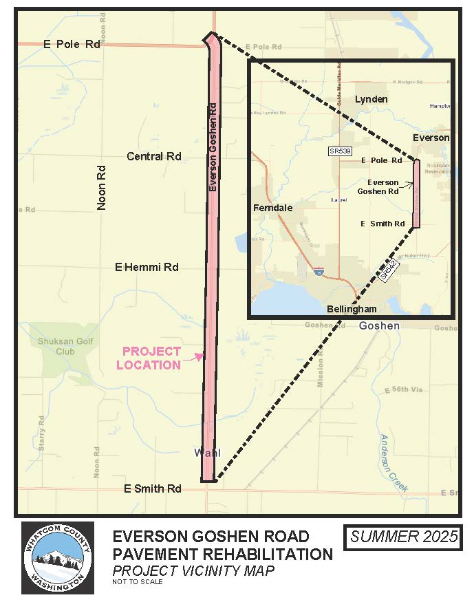 The project contractor will grind and pave the roadway and restripe the lane lines on Everson Goshen Road between E Smith Road and E Pole Road (SR544). Drivers should prepare for single-lane closures and travel delays. Alternate routes are recommended to avoid extended wait times. There will be no detour route posted.