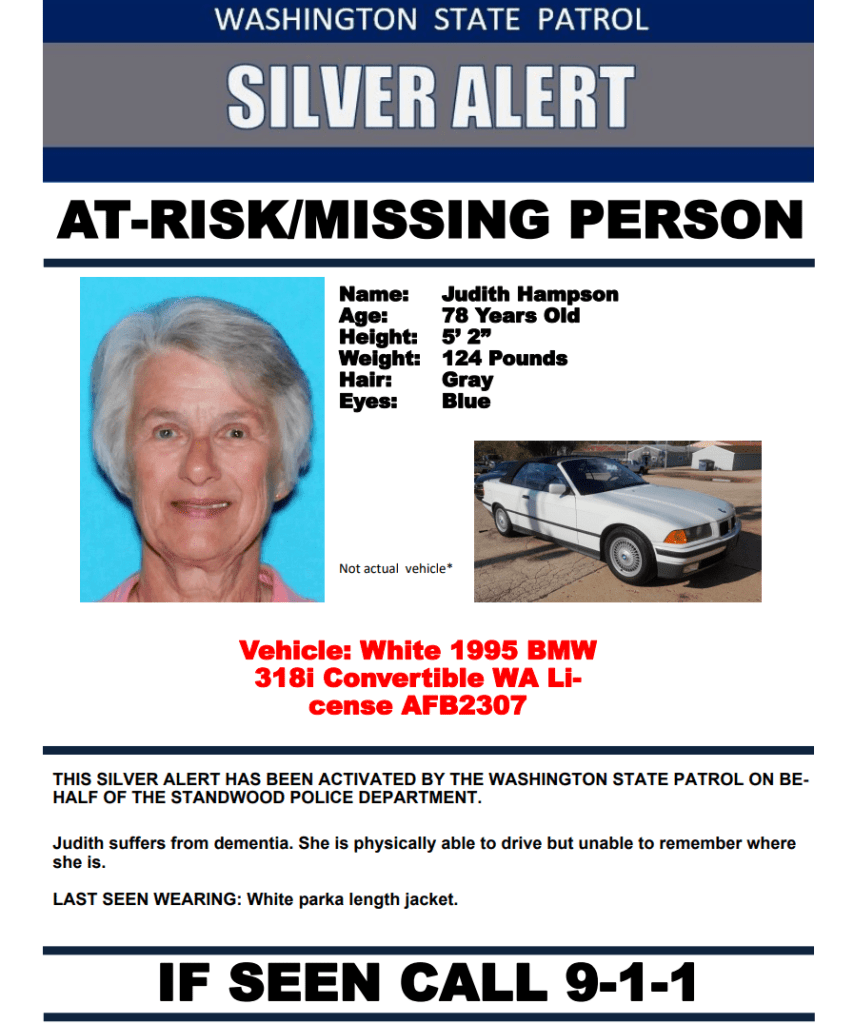SILVER ALERT: Stanwood area woman reported missing By Staff on December 4, 2022 5:02pm Update 8:30pm: Alert canceled. She had been located. Share this with friends/family via: Share on Facebook (Opens in new window) Facebook Share on Bluesky (Opens in new window) Bluesky Share on X (Opens in new window) X Share on Reddit (Opens in new window) Reddit Share on Nextdoor (Opens in new window) Nextdoor Share on Threads (Opens in new window) Threads Share on LinkedIn (Opens in new window) LinkedIn Share on Tumblr (Opens in new window) Tumblr Share on WhatsApp (Opens in new window) WhatsApp Print (Opens in new window) Print Email a link to a friend (Opens in new window) Email Discover more from Whatcom News Subscribe to get the latest posts sent to your email. Type your email… Subscribe