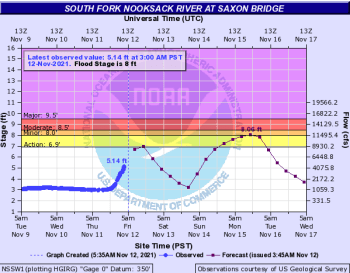 The NWS Seattle office reported today heavy rains from today’s atmospheric river event is primarily impacting central and southern regions of western Washington. This will spare Whatcom County from any significant immediate flooding but they also expect another atmospheric river event over the northern regions, including the North Cascades, Sunday and Monday. Heavier mountain rain from this system is expected to drive the Nooksack River level up further as indicated on current river level forecasts.