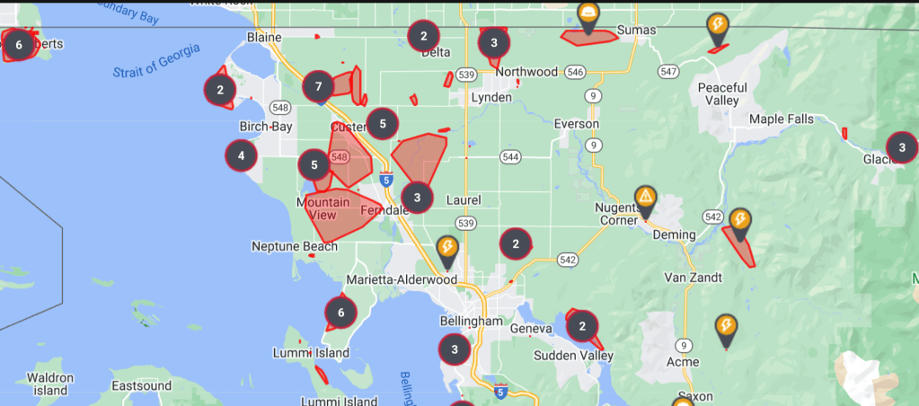 Puget Sound Energy reported nearly 7,700 of their customer addresses in Whatcom County were without power as of 2:30am. That number had been reduced to 4,730 by 5:40am.