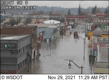 By 11:30am, floodwater was visibly accumulating in Sumas as seen from a WSDOT traffic camera.