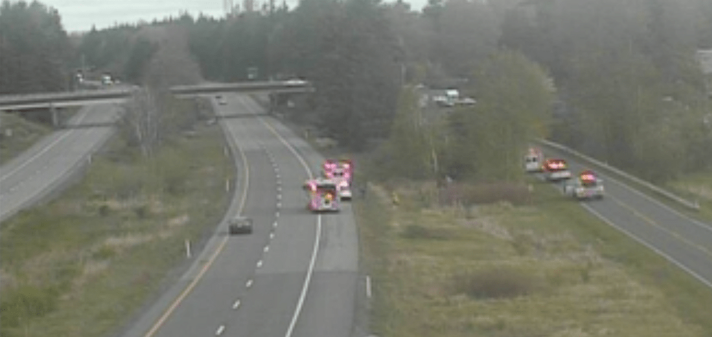 The trailer of the overturned semi-truck stretched across the median and into the northbound lanes.