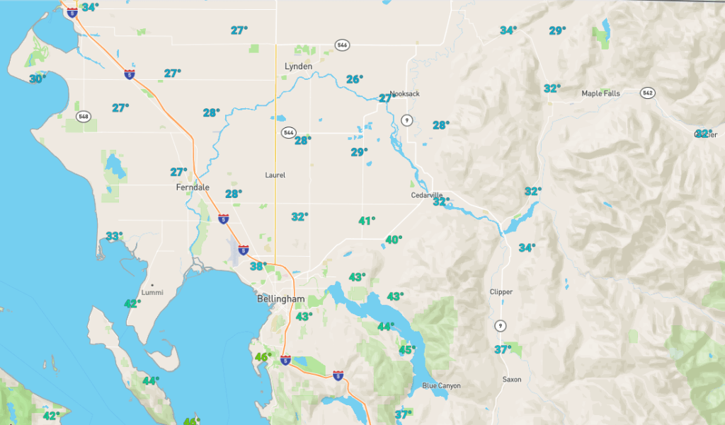As of 5pm, temperatures reported in Bellingham and to the south were in the 40s while areas only a few miles to the north remained in the upper 20s.
