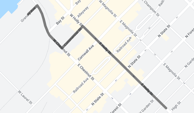 E & W Holly Streets, Commercial Street and W Chestnut Street will be closed to traffic during the parade. All traffic at the following cross-streets will be temporarily stopped in both directions at the parade route while the parade passes by.