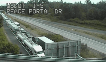 Washington State Patrol Trooper Rocky Oliphant said they hoped the line of trucks on I-5 would be contained to the right shoulder but he was hearing reports that both lanes were blocked in some sections. WSP troopers are in the area in an effort to keep traffic moving.
