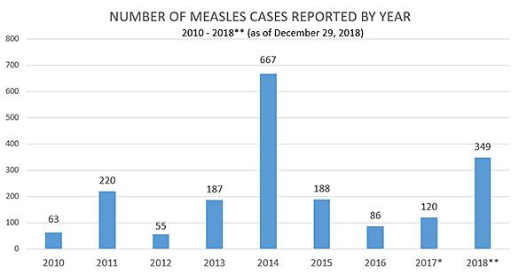 The Centers for Disease Control and Prevention (CDC) reports 349 individual cases of measles were confirmed during 2018 in 26 states, including Washington State, and the District of Columbia. This is the second-largest number reported since 2000. The greatest was 667 cases reported in 2014.