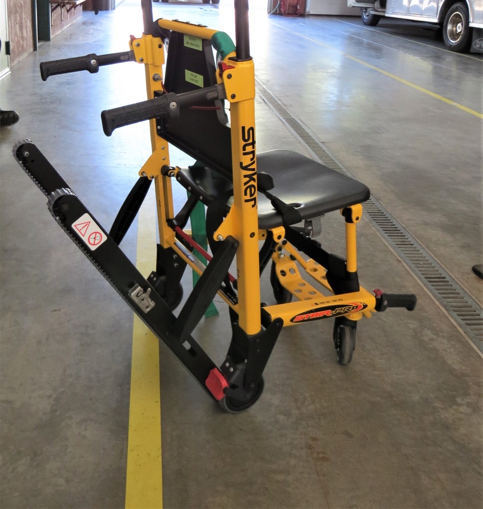 In addition to the gurneys, Stryker Stair-PRO chairs were purchased to replace heavier stair chairs that were getting close to their useful lifespan. A stair chair is used when moving a patient in close quarters, such as stairwells or small elevators, when using a gurney is not possible.
