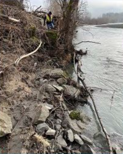 Existing riprap protecting the Nooksack River bank upstream of Everson near the TransMountain pipeline crossing is damaged and requires stabilization measures. Design and permitting work are being fast-tracked. Construction will occur in 2023. The proposed improvements will incorporate habitat features.