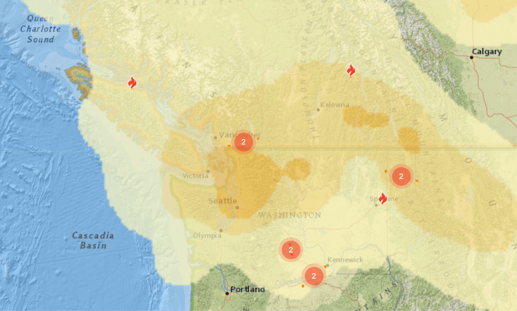 A Friday post to the Washington Smoke blog, a partnership between state, county, and federal agencies, and Indian tribes, said they were “keeping an eye on the wildfires burning in Alberta and British Columbia–shifting conditions to winds from the north could lead to smoke impacts in Washington State next week. At this time it’s uncertain how much of that transported smoke will reach the surface and how much will stay above us in the atmosphere.”